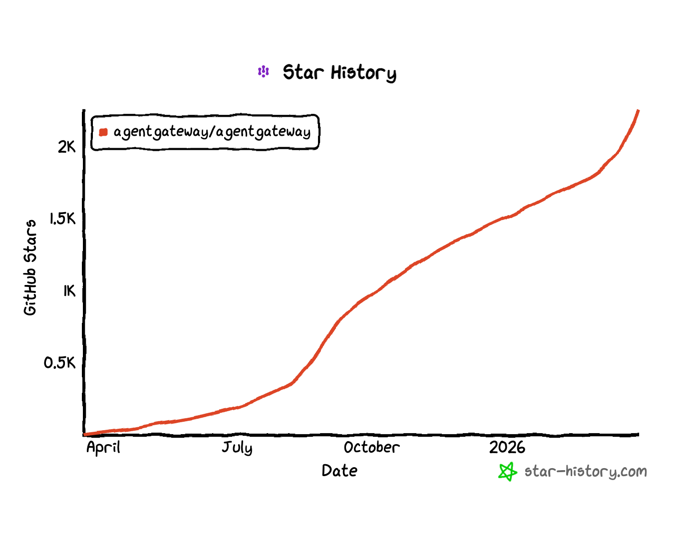 We have over 2,000 GitHub stars on agentgateway’s main repository, with continuing growth. Thank you everyone who starred the agentgateway repo.